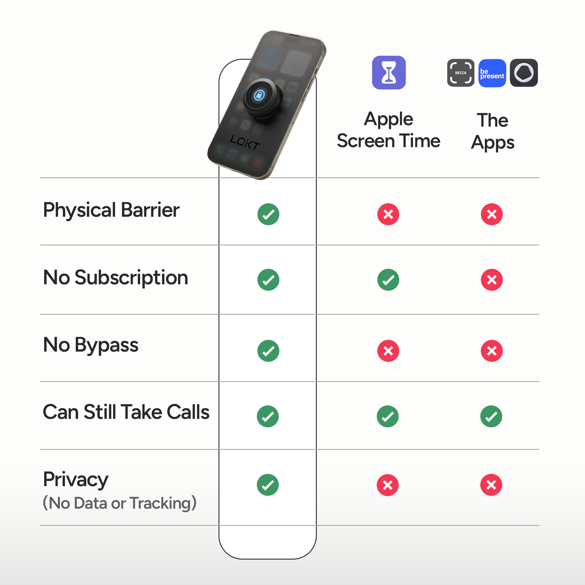 LOKT blocks the scroll, not the phone. Calls come through. Siri still works. You're not cut off from life. You're just free from the feed.